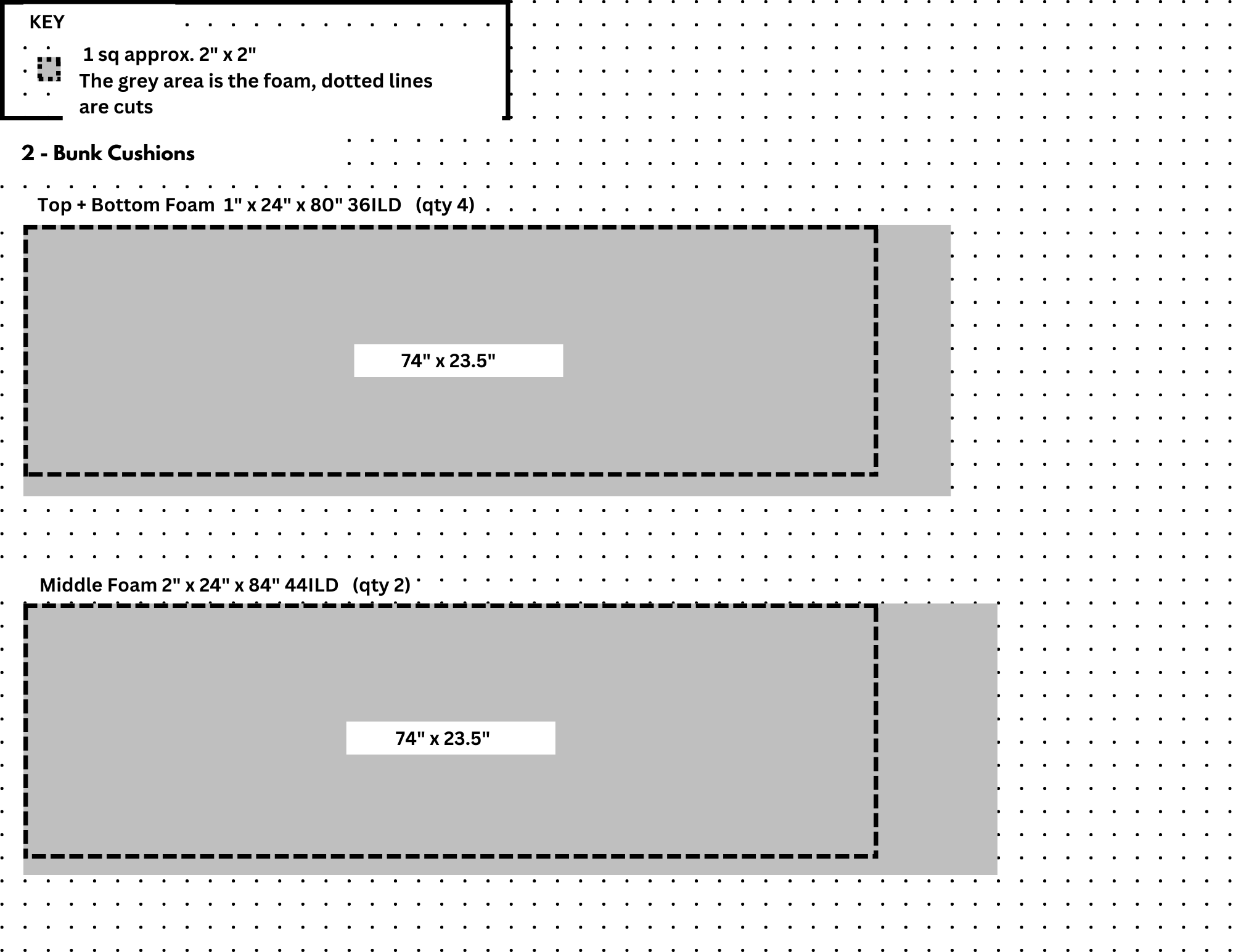 2" Thick, 44ILD (Firm), 24" W x 84" L – 3 pieces (for bunks)